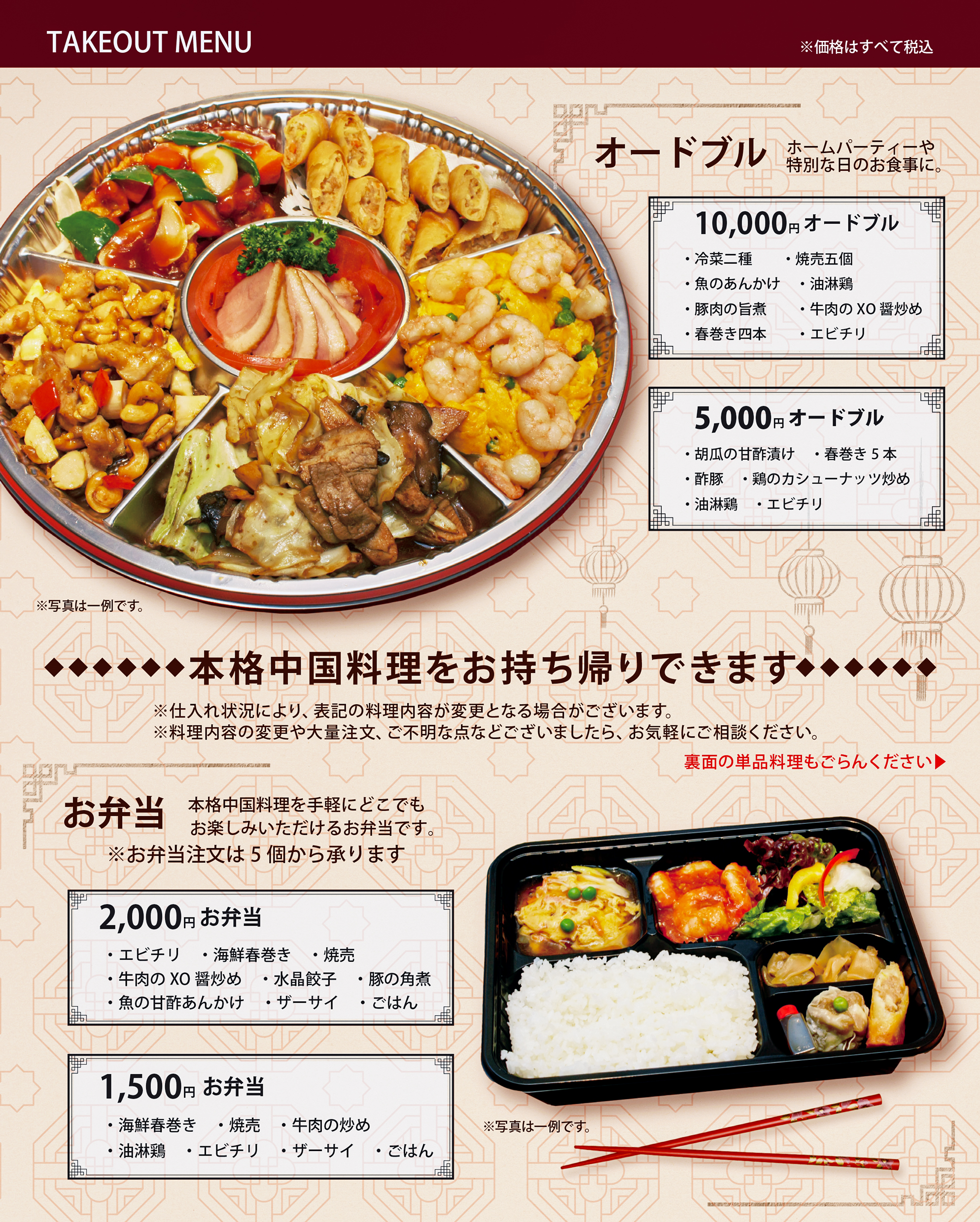 お一人様5,000円のお料理の例です。メニューはご予算、ご要望に応じて変更可能ですので、詳しくはお問い合わせください。